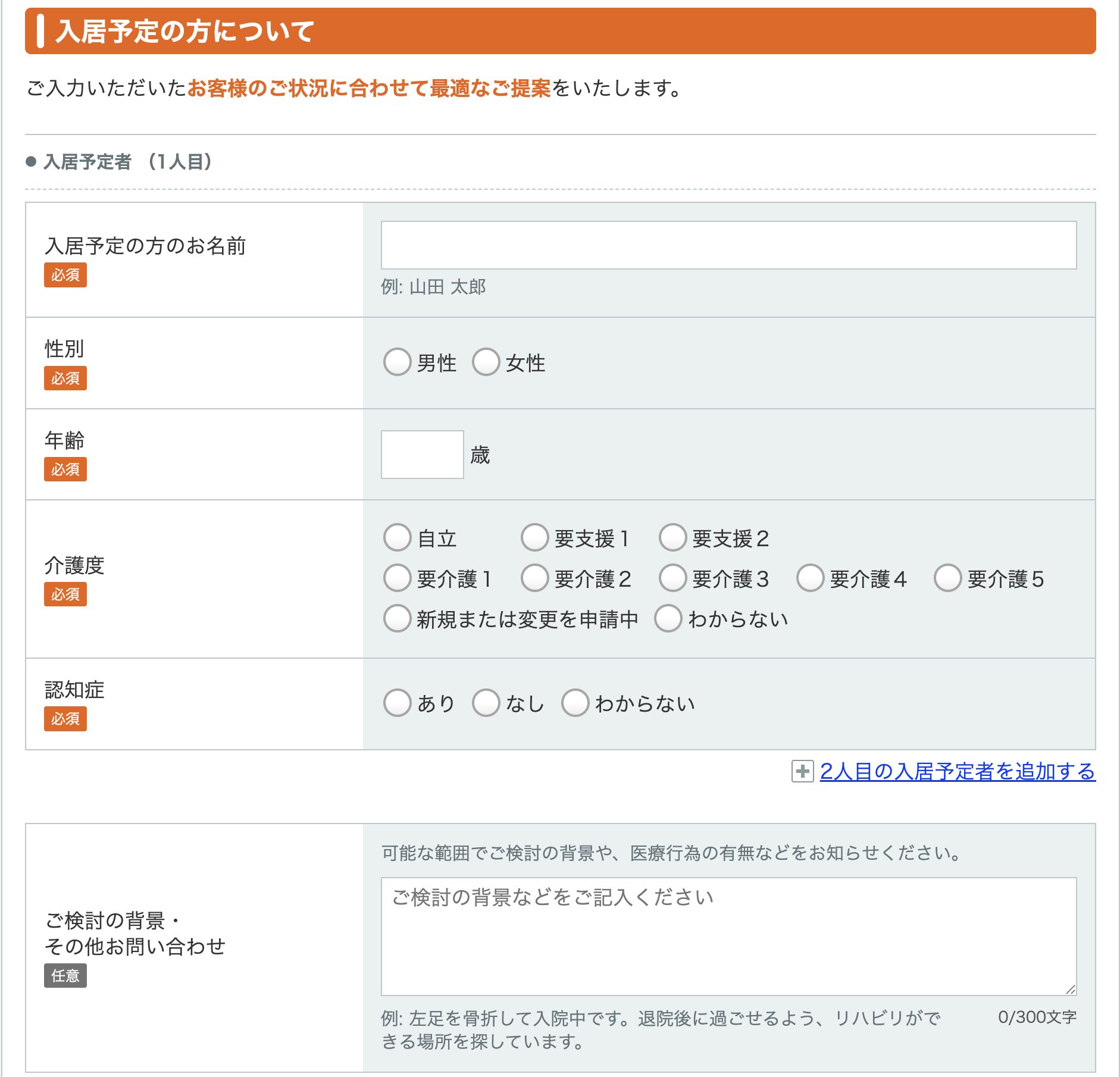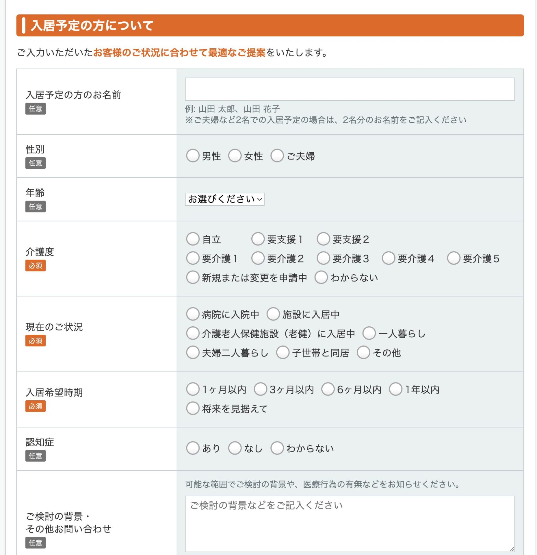 介護度、現在の状況、入居希望時期は必須項目です。