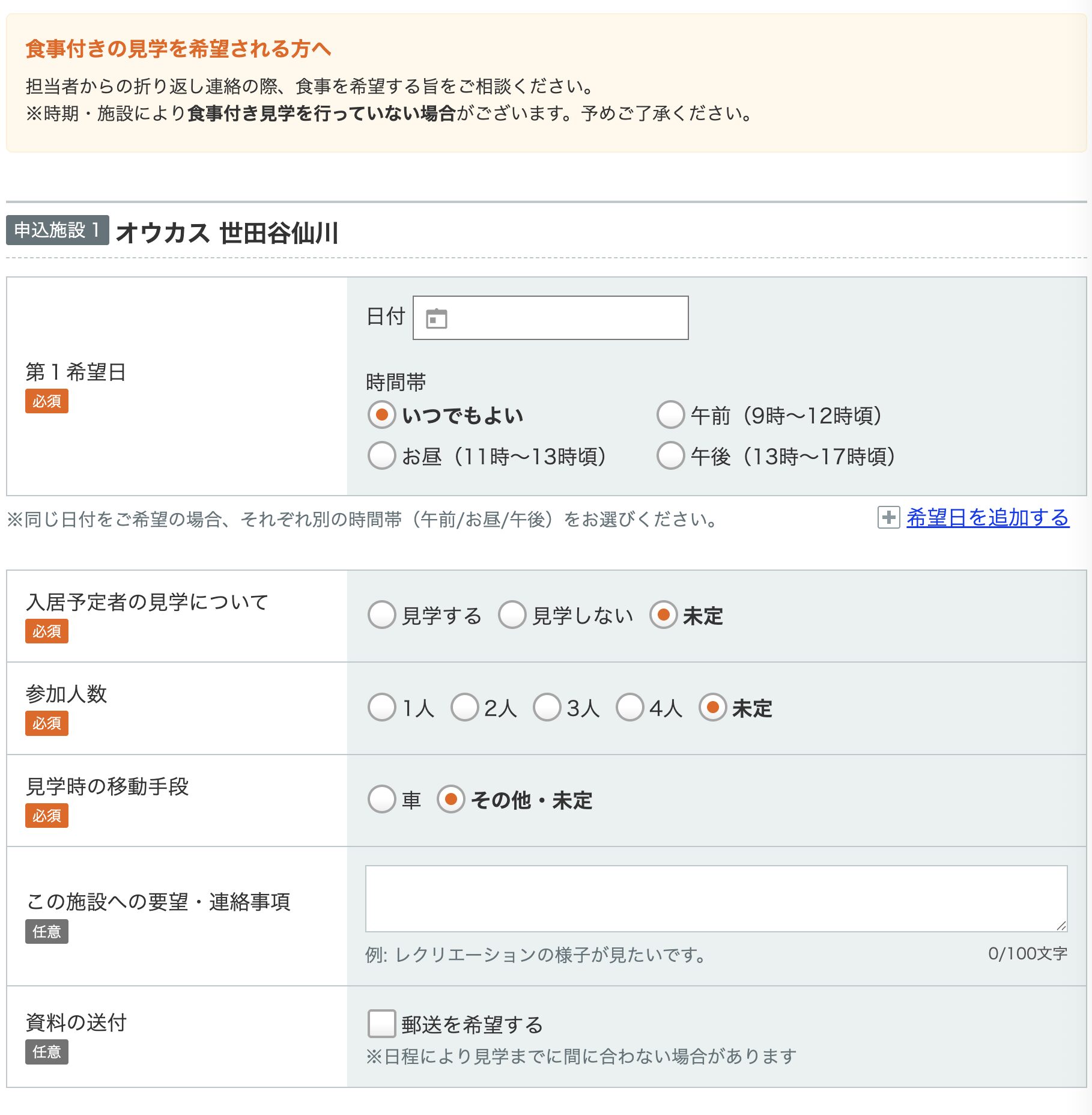 見学するスケジュールの入力と、入居予定者について氏名、性別、年齢、介護度、認知症の有無について入力が必要です。
