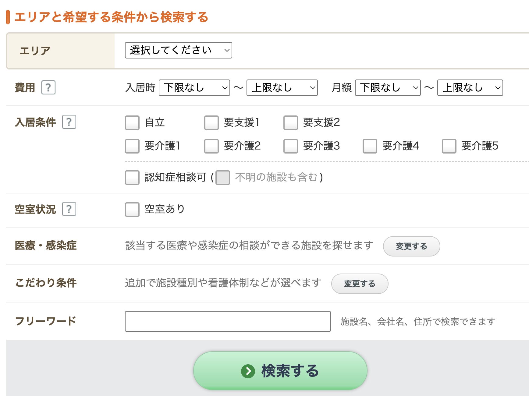 具体的には老人ホームの種類、費用帯、食事メニューの選択の有無、築浅、夫婦ふたりでの入居の可否があります。
