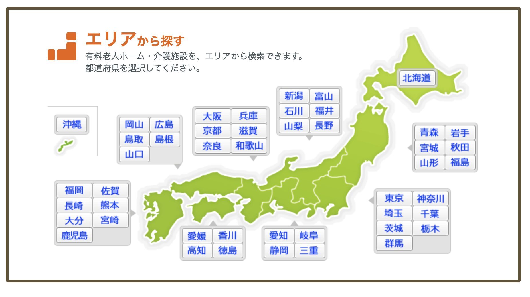 簡単な項目を入力することで、条件にあう老人ホームを検索することができます。