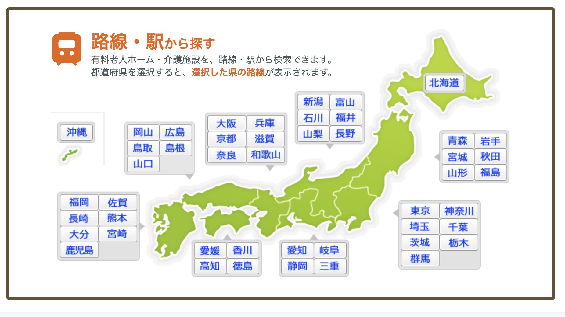 要介護度、こだわりの条件だけでなく、老人ホームのエリアや最寄り駅からも検索することができます。
